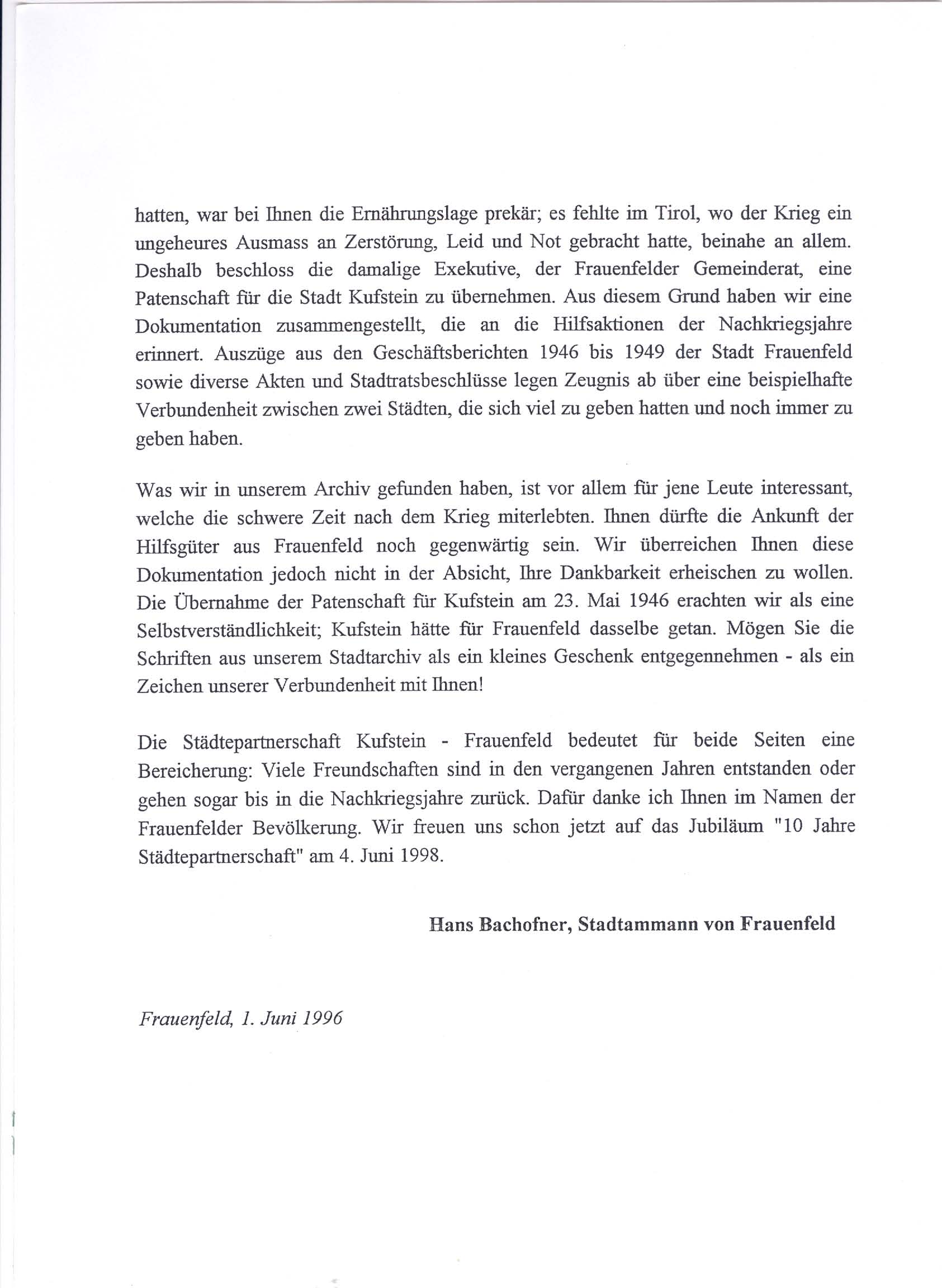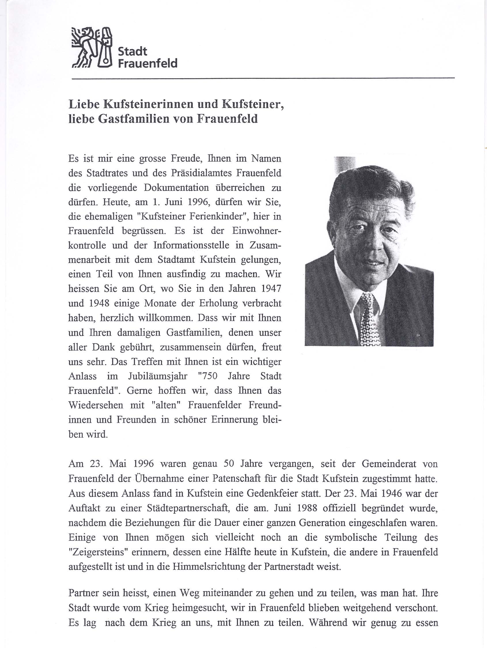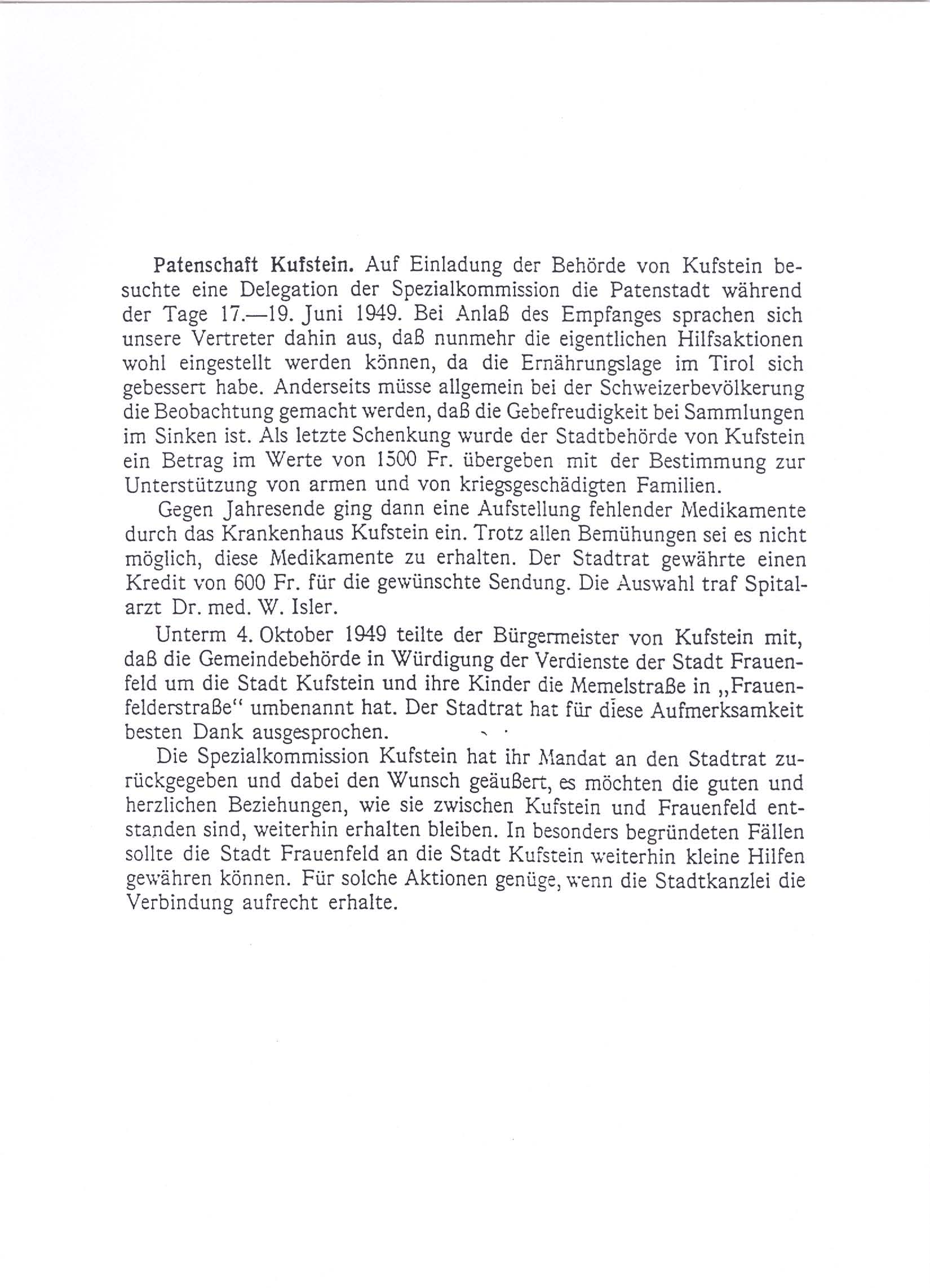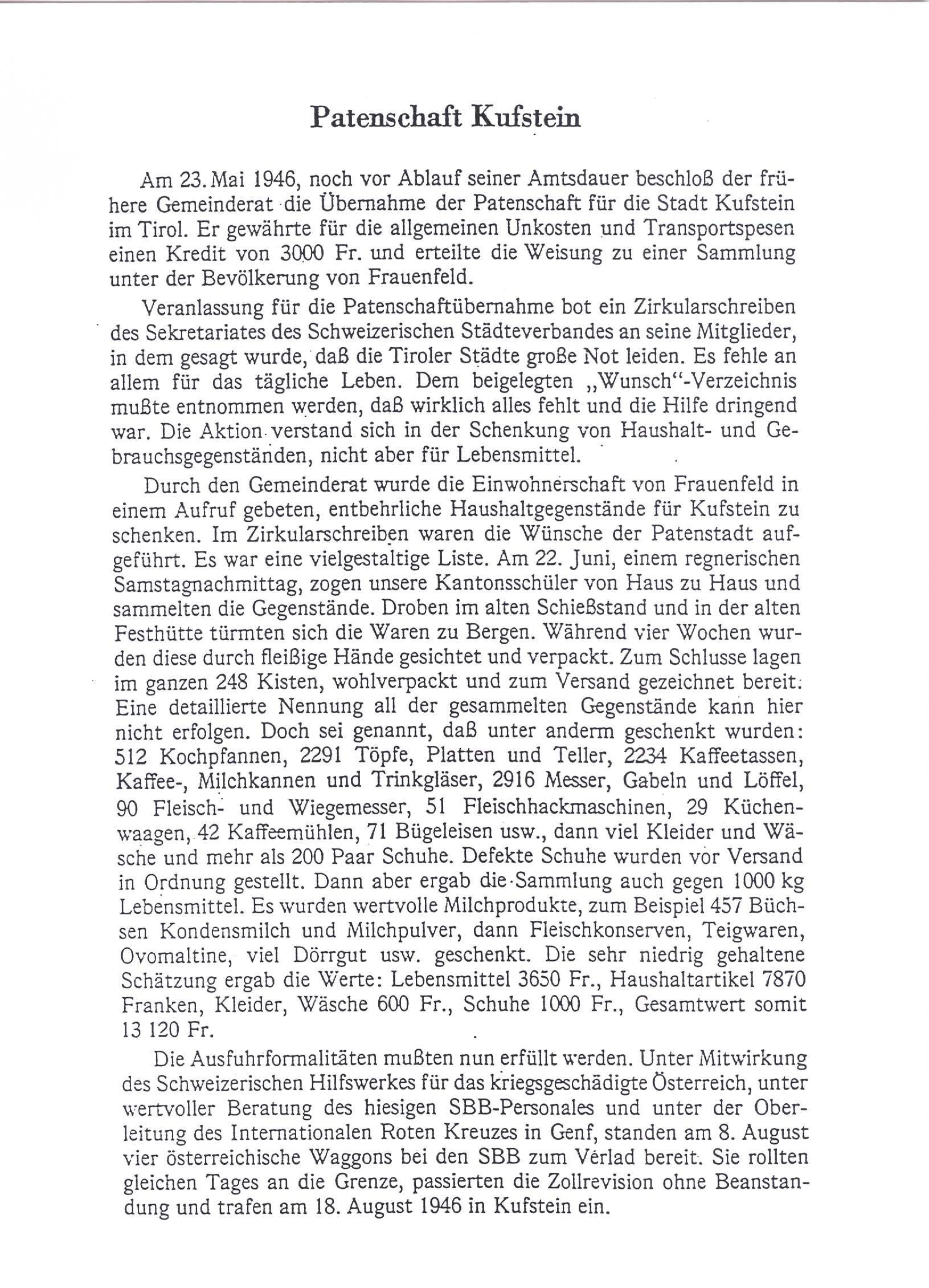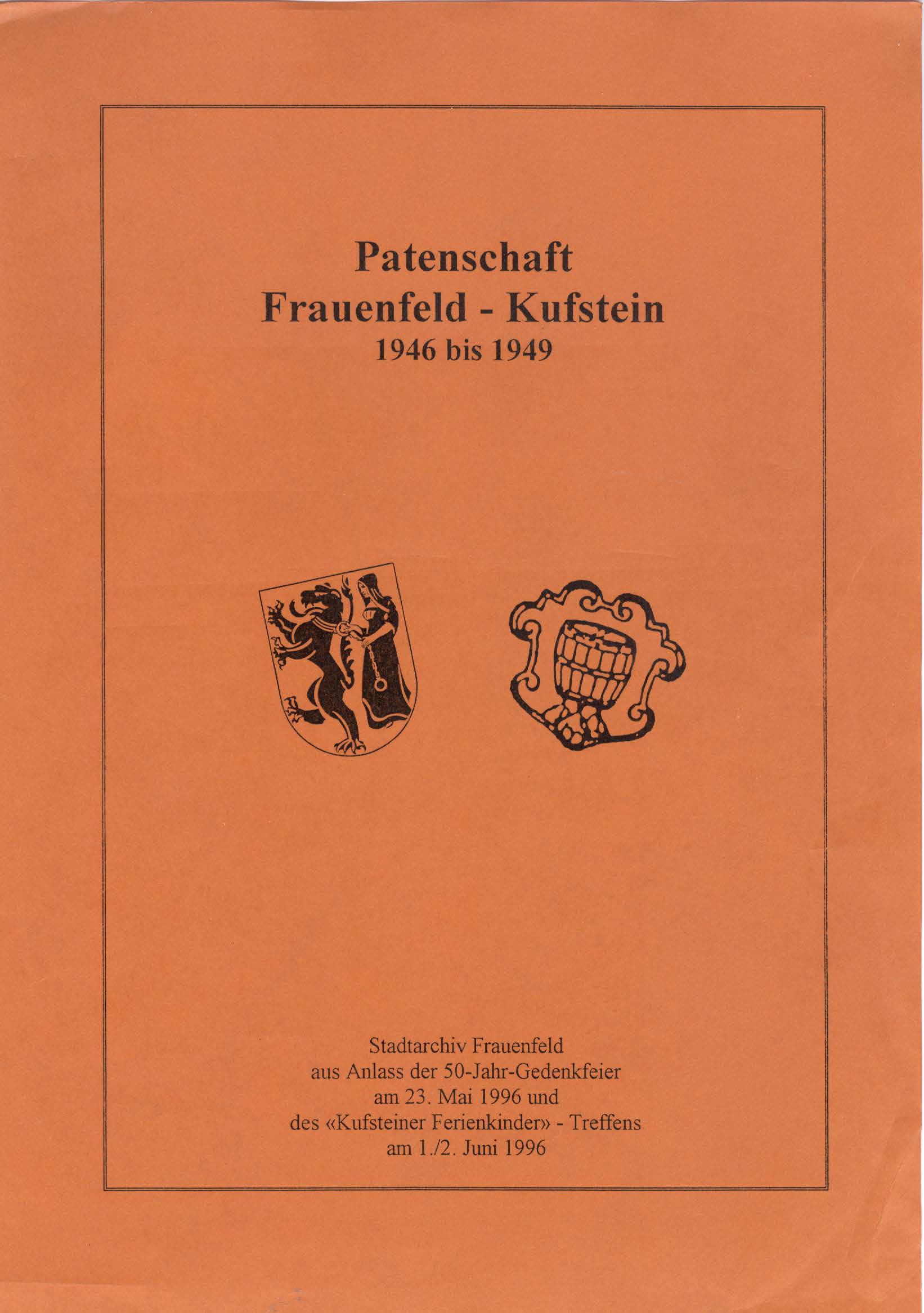 Aus Anlass der 50-Jahr-Gedenkfeier am 23. Mai 1996 und des „Kufsteiner Ferienkinder“ – Treffens am 1. und 2. Juni 1996 verfasste das Stadtarchiv Frauenfeld eine Dokumentation „Patenschaft Frauenfeld – Kufstein 1946 bis 1949“