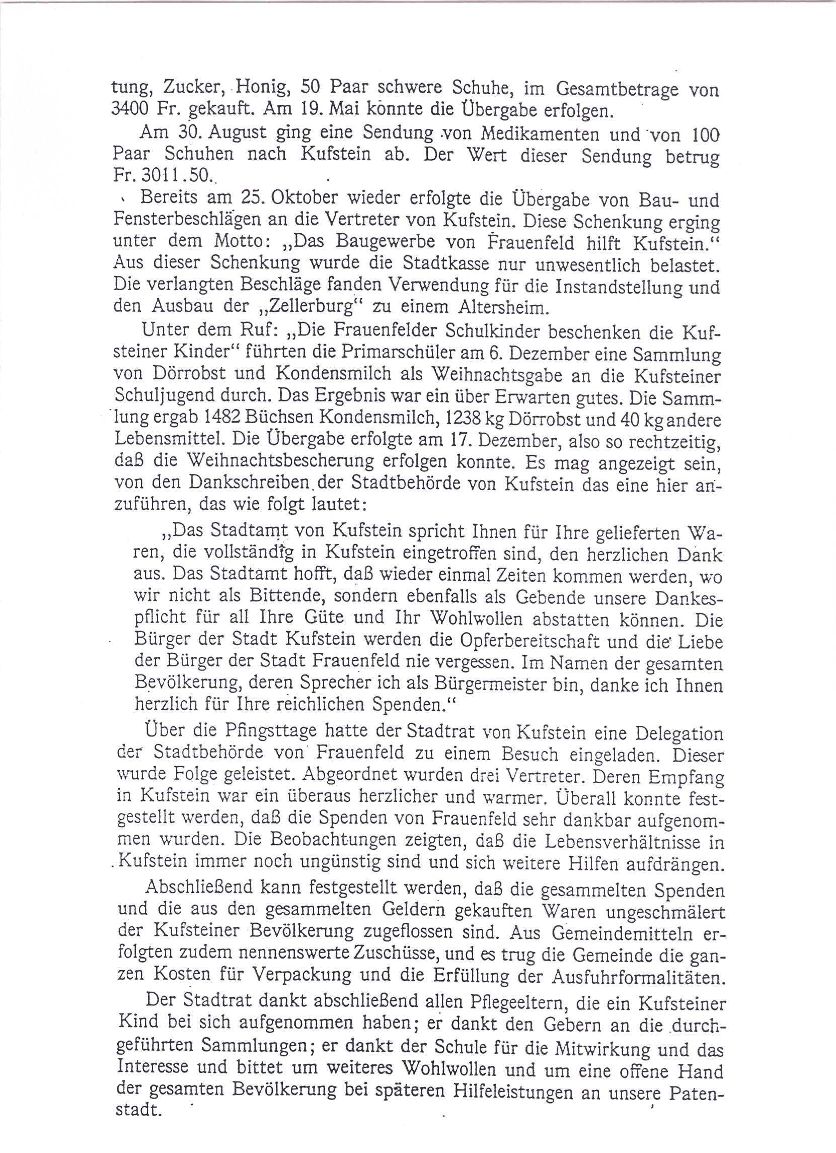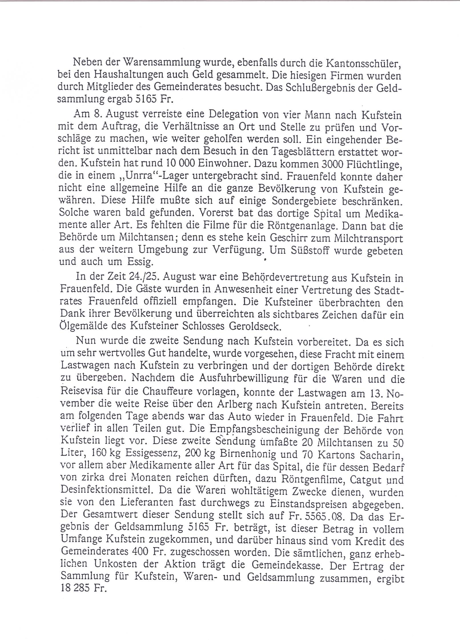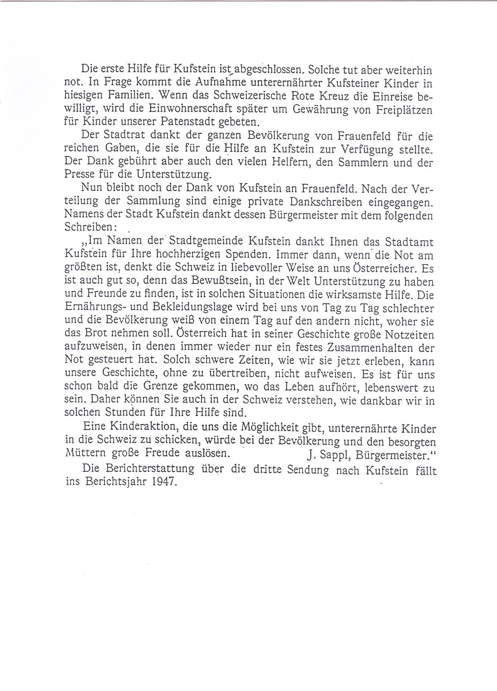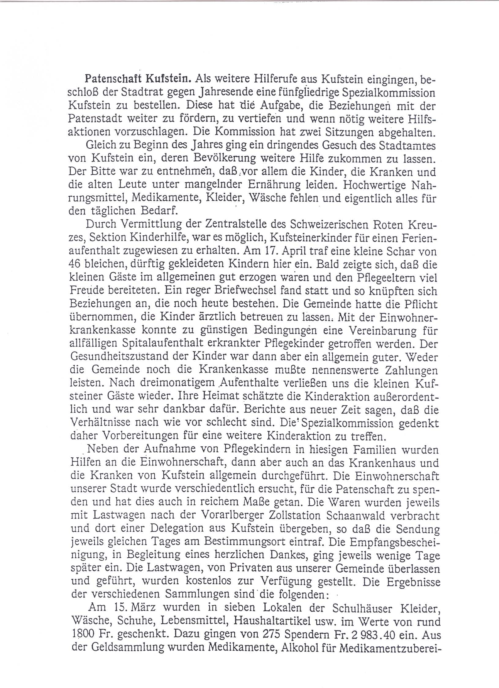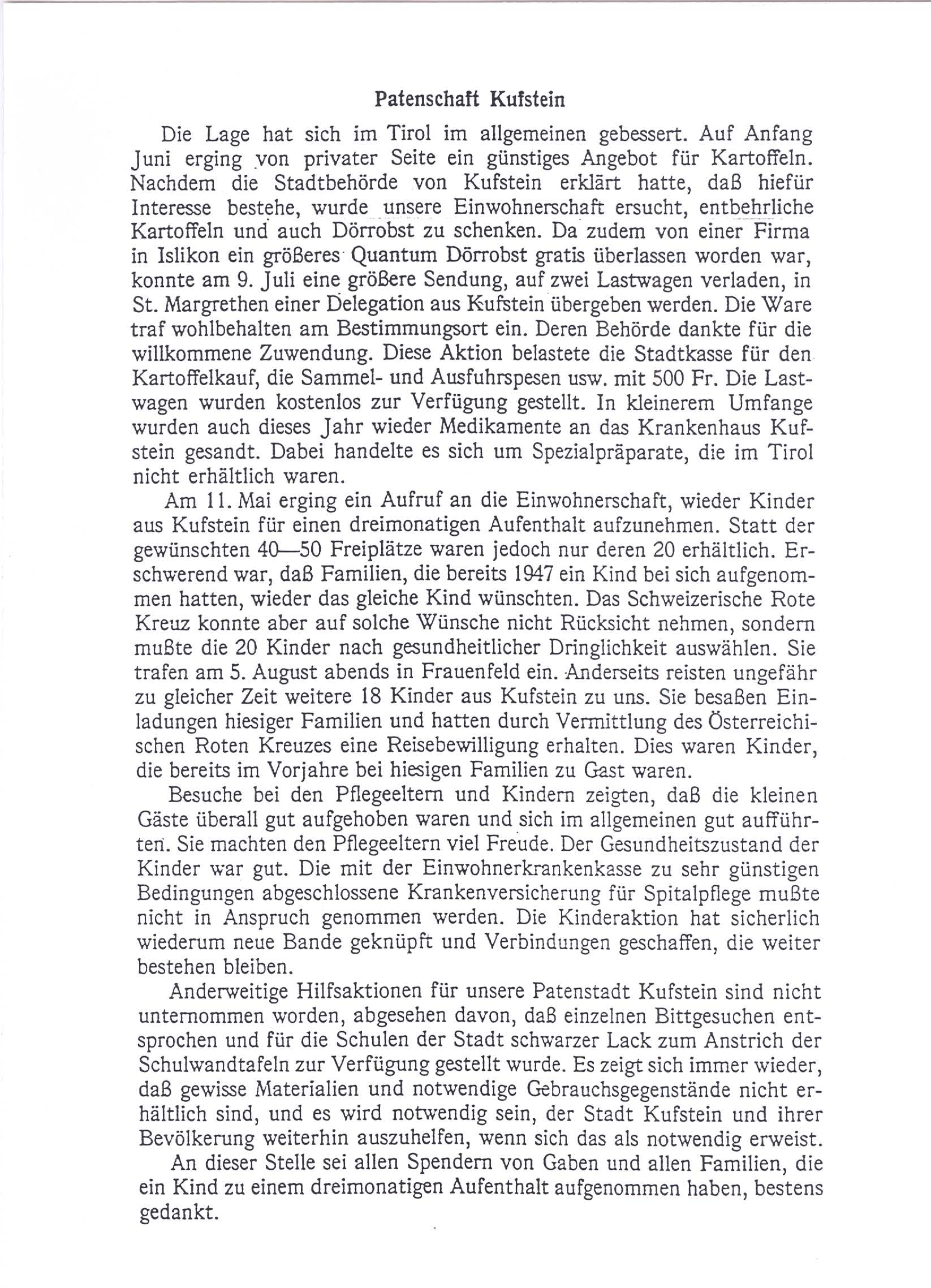 Aus Anlass der 50-Jahr-Gedenkfeier am 23. Mai 1996 und des „Kufsteiner Ferienkinder“ – Treffens am 1. und 2. Juni 1996 verfasste das Stadtarchiv Frauenfeld eine Dokumentation „Patenschaft Frauenfeld – Kufstein 1946 bis 1949“