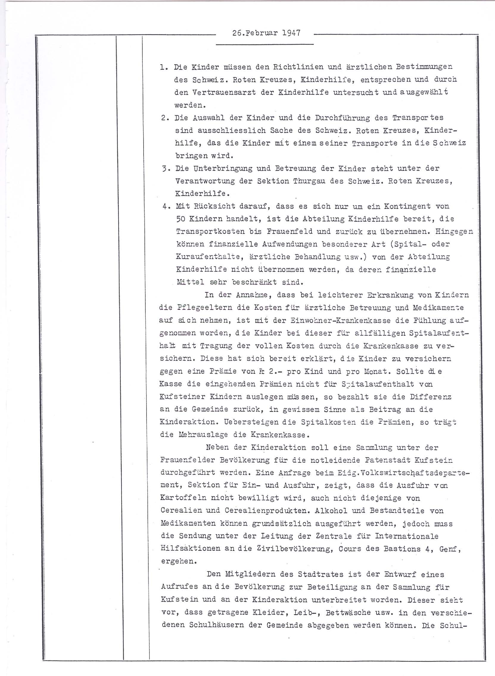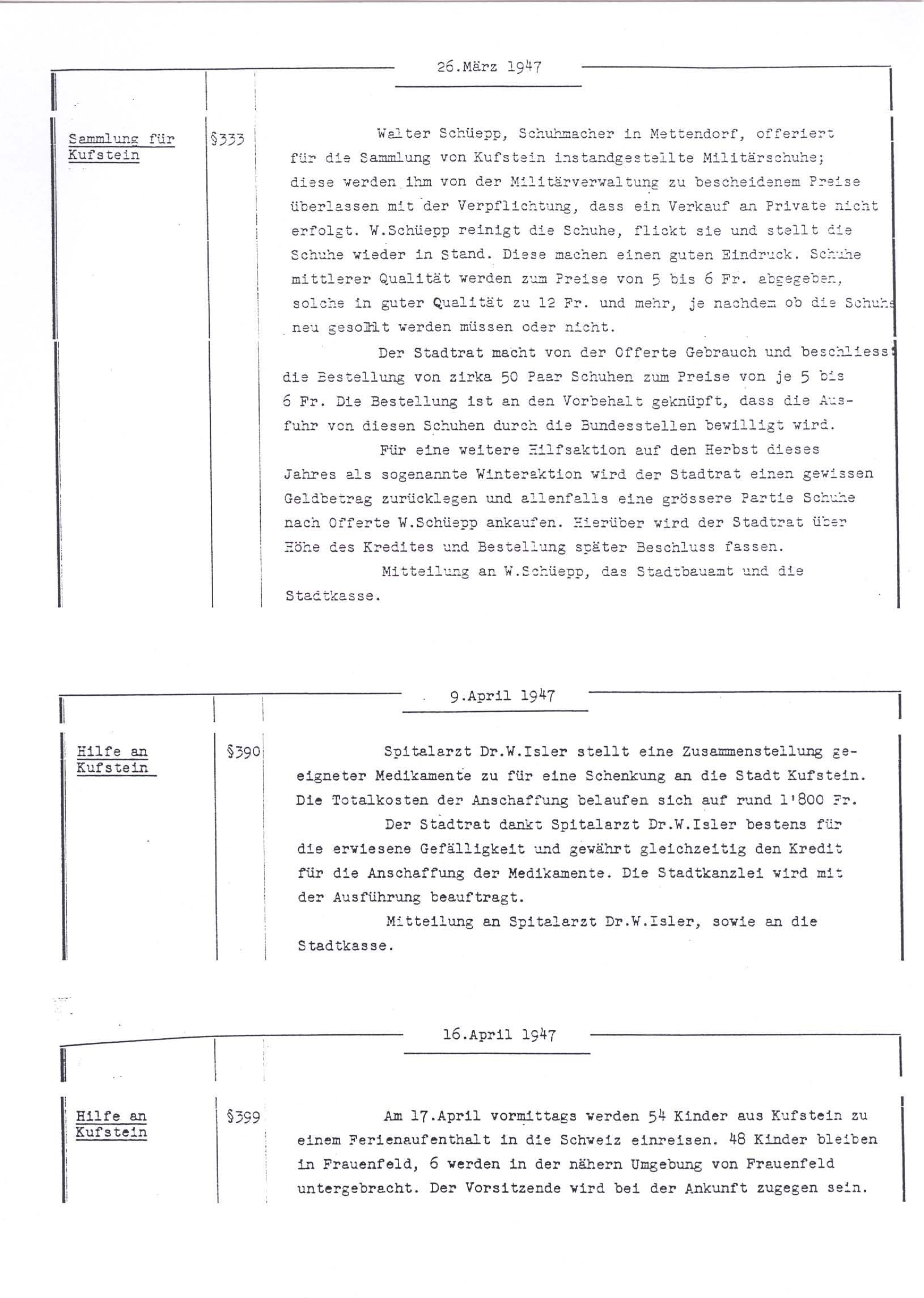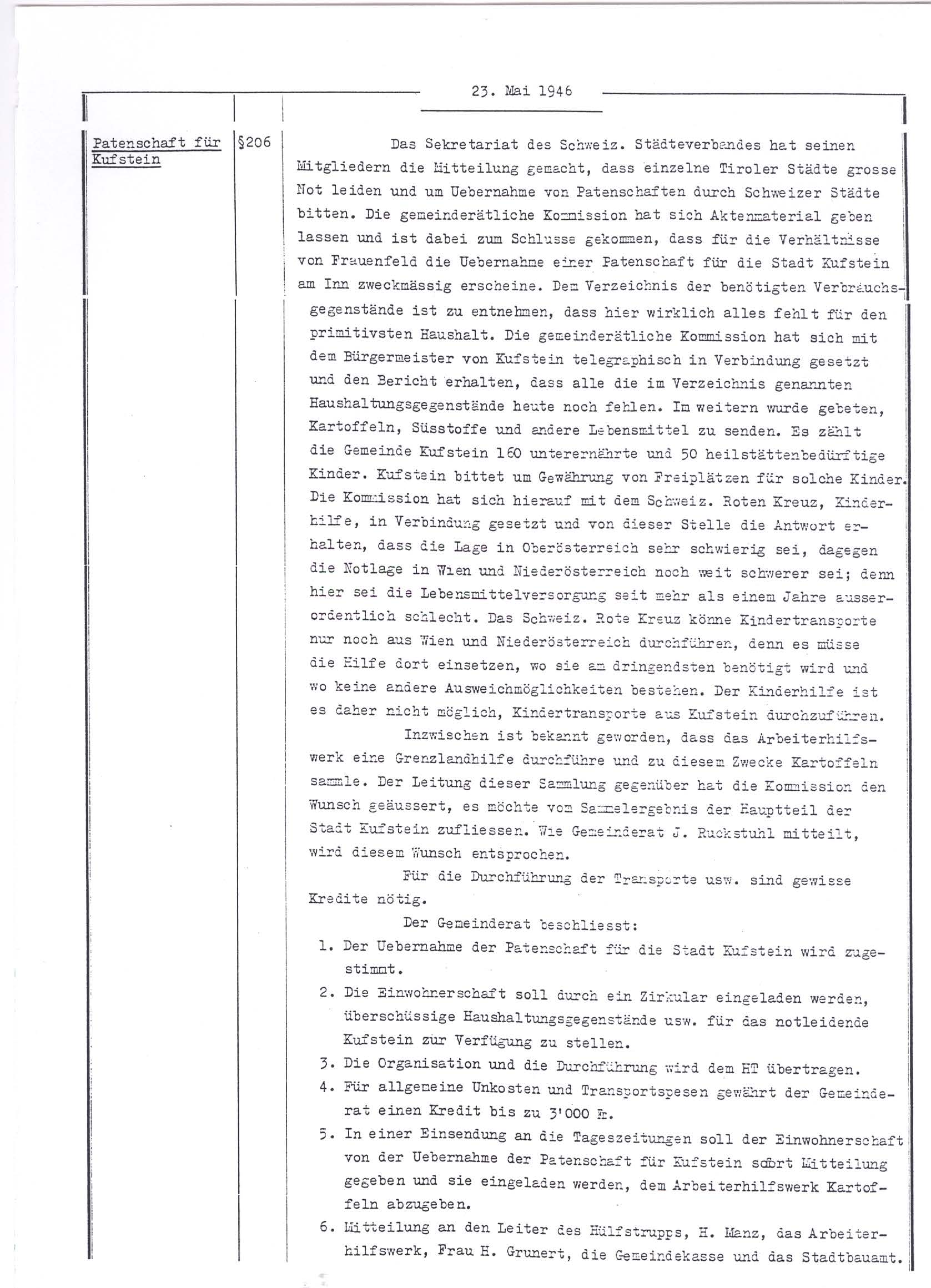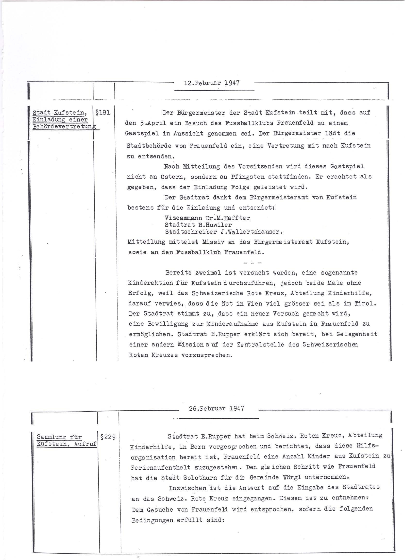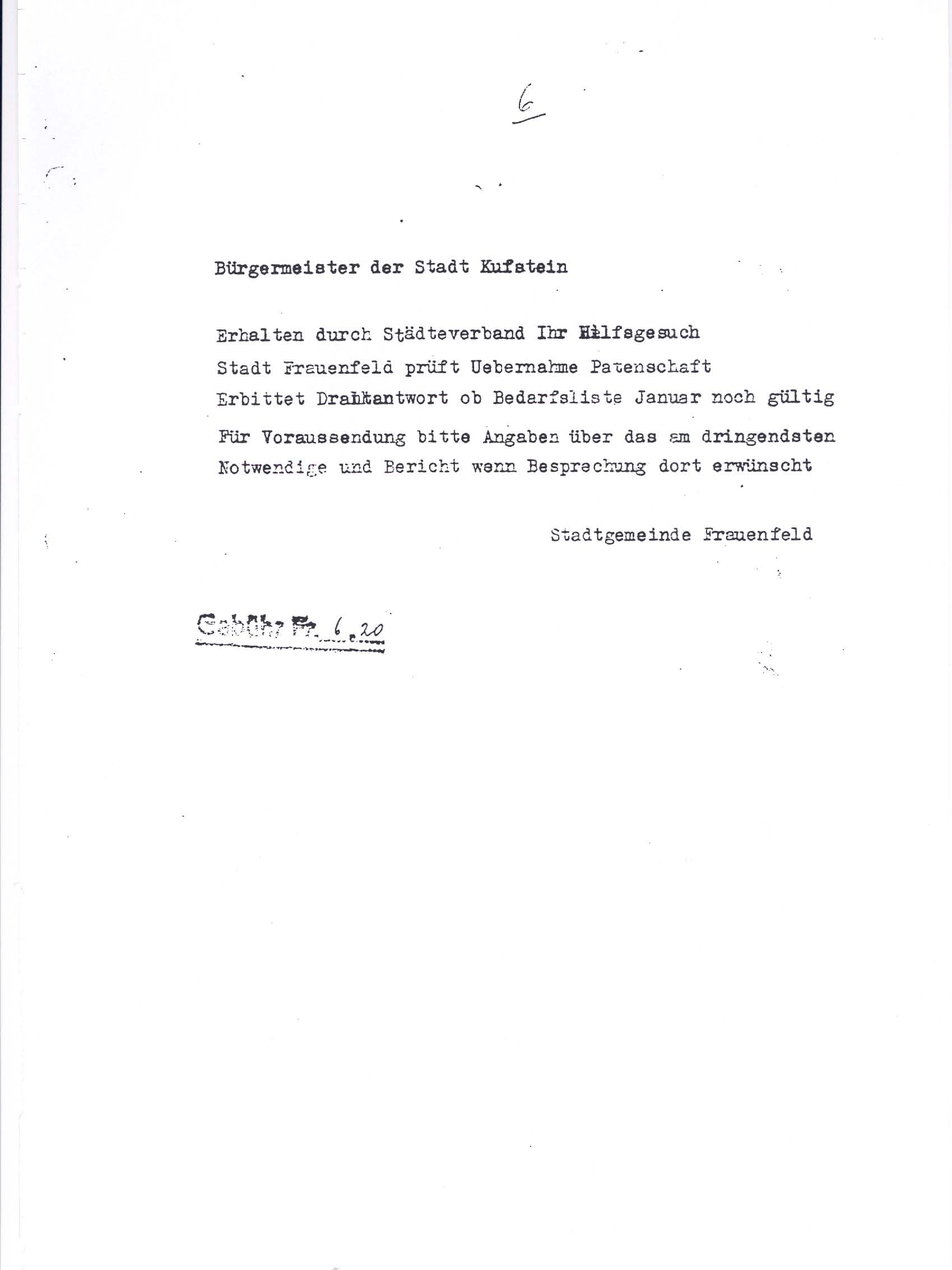 Aus Anlass der 50-Jahr-Gedenkfeier am 23. Mai 1996 und des „Kufsteiner Ferienkinder“ – Treffens am 1. und 2. Juni 1996 verfasste das Stadtarchiv Frauenfeld eine Dokumentation „Patenschaft Frauenfeld – Kufstein 1946 bis 1949“