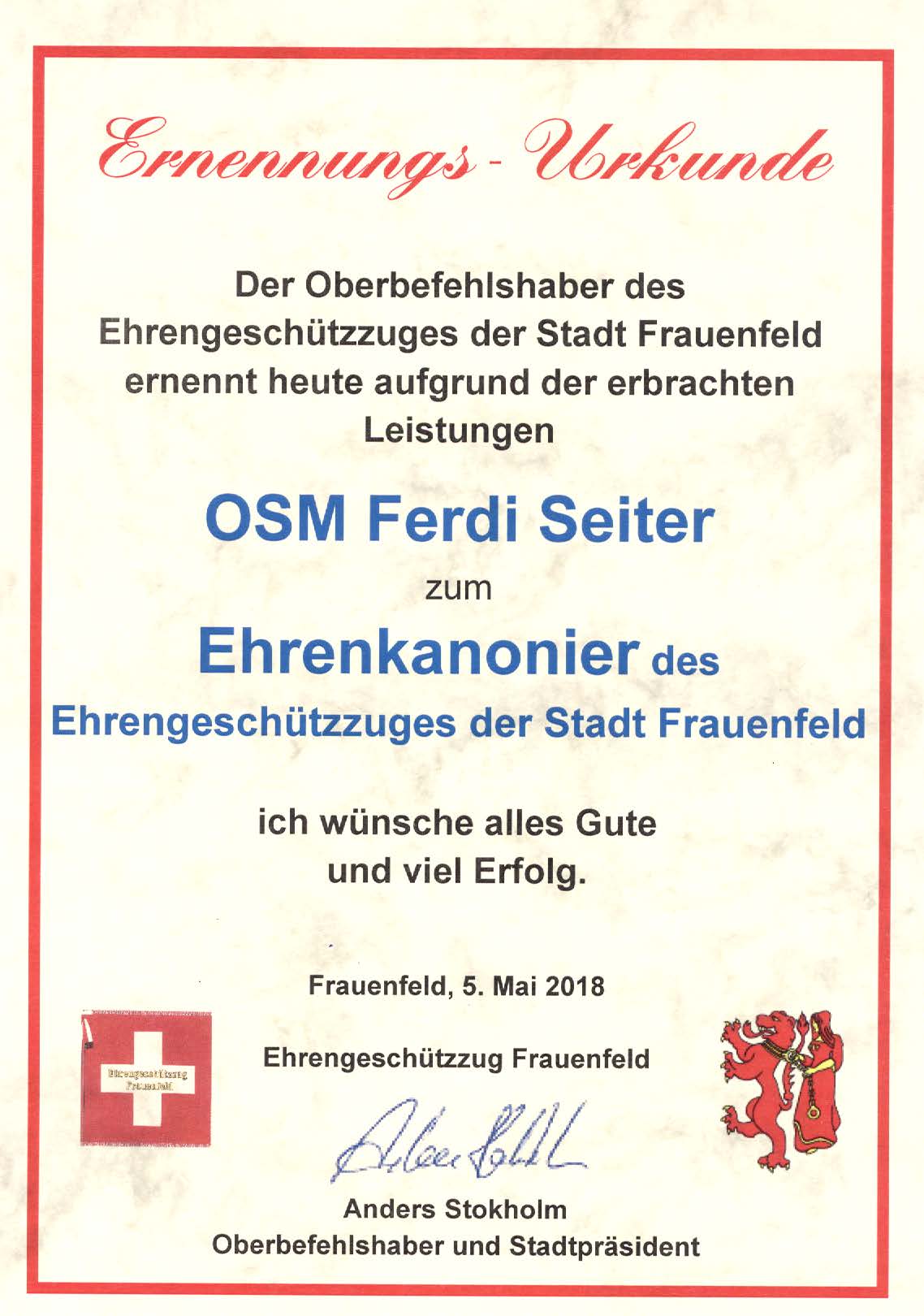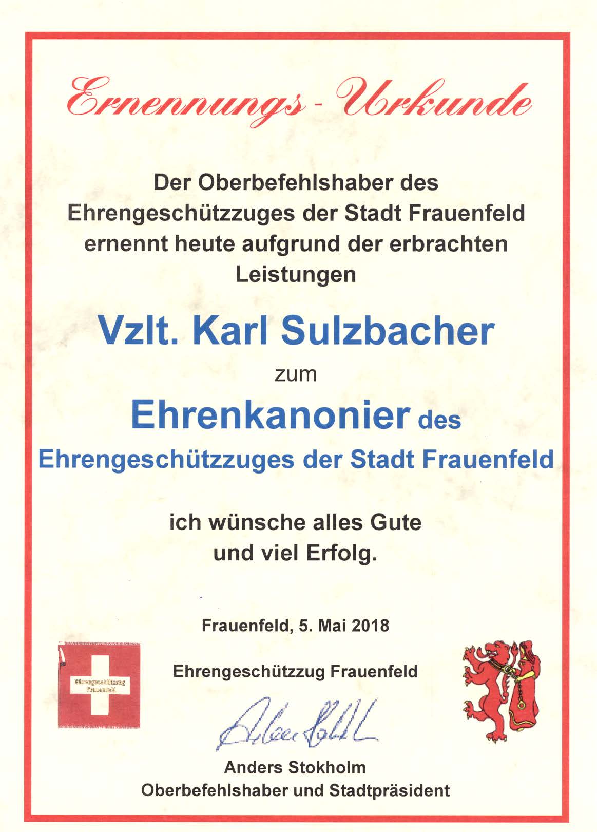 18.00 Uhr Begrüssungsworte Oberbefehlshaber Mag. Martin Krumschnabel und Ehrung Vzlt. Karl Sulzbacher, OSM Ferdinand Seiter und Kanonier Georg Einweiler im „Frauenfelder Stüberl“