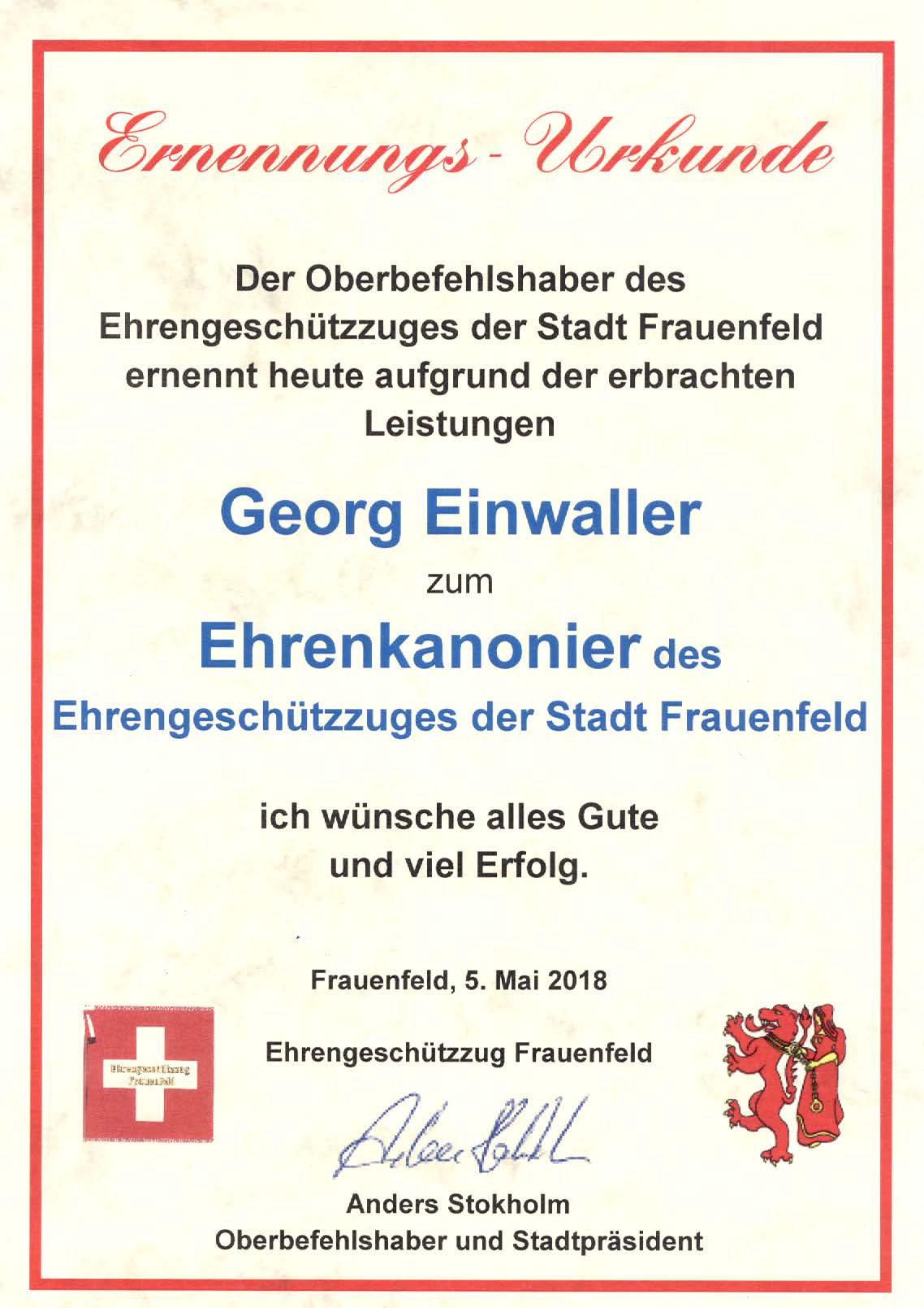Ehrengeschützzugfonds Kufstein und Frauenfeld: CHF 200.–