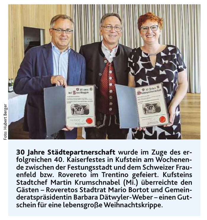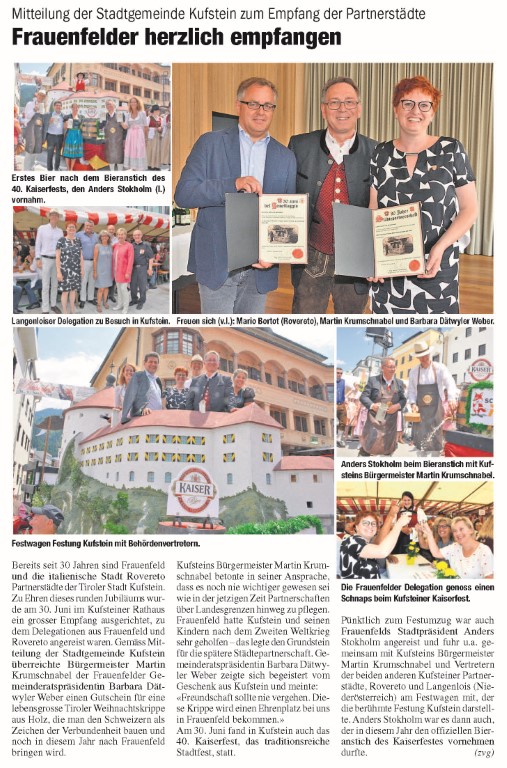 Das Informationsblatt berichtete über das 25-Jahrjubiläum Städtepartnerschaft Kufstein Frauenfeld vom 30. und 31. Mai 2013 im Frauenfelder Rathaus und vom 27. und 28. September 2013 auf der Festung Kufstein.