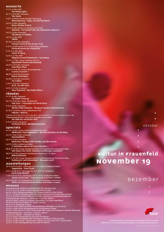 Die Jahresprogramme 2019 und 2020 wurden den Anwesenden vorgestellt, hervorzuheben ist die nächste Vereinsversammlung: Freitag, 28. Februar 2020, 19.30 Uhr, 5. Vereinsversammlung in Frauenfeld Rathaus.